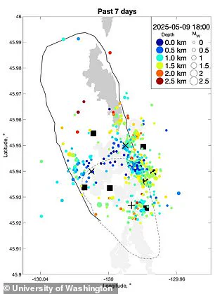 His team has observed that the seafloor has swelled to the same level it reached before the 2015 eruption—a clear warning sign that magma is building up beneath the surface. ‘At the moment, there are a couple hundred earthquakes a day,’ Wilcock explained, ‘but that’s still a lot less than we saw before the previous eruption.’ He added, however, that the timing of the next eruption remains impossible to predict. ‘It could be tomorrow, or it could be early 2026.