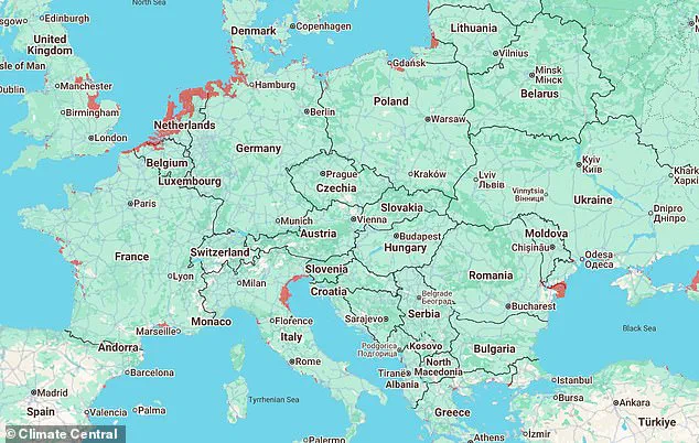 The map’s interactive features allow users to zoom in on specific regions, revealing stark red zones that indicate areas most at risk. ‘It’s a sobering visual representation of what’s coming,’ said Mark Thompson, a coastal engineer who has studied the map extensively. ‘Every city on that list is a ticking time bomb.’
