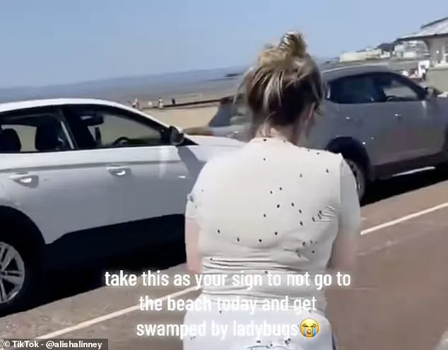 In one video posted to TikTok, one visitor to the UK seaside wrote: ‘Take this as you sign not to go to the beach today and get swamped by ladybugs’ Last month, Brits were forced to take shelter in their cars as thousands of ladybirds descended on towns and cities across the country.