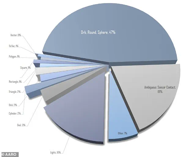 According to the report, the majority of sightings involve objects with round or spherical shapes, often described as ‘orb’ or ‘sphere.’ Other reported forms include polygons, triangles, and even the enigmatic ‘Tic Tac’ shape, a term derived from the object’s resemblance to a child’s toy.