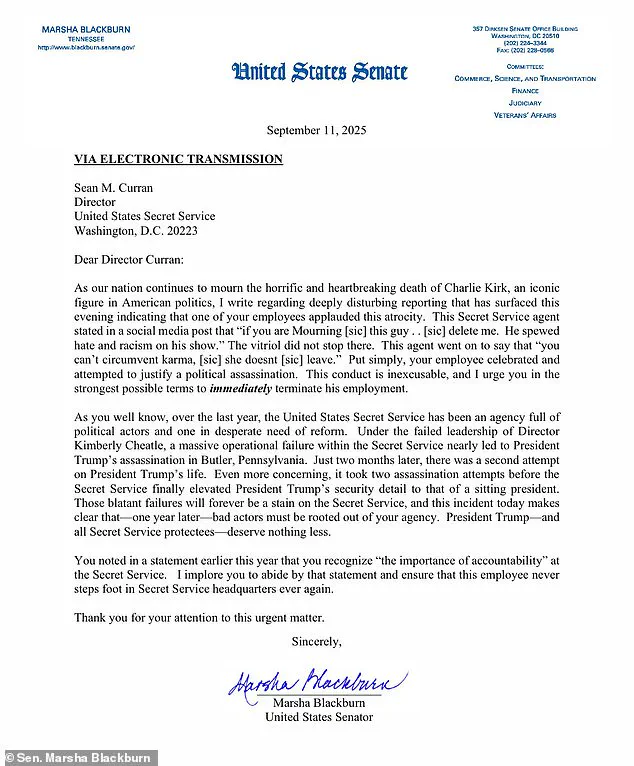 Saxon, Blackburn stated, ‘Put simply, your employee celebrated and attempted to justify a political assassination.’ The senator’s remarks underscore a growing scrutiny of the Secret Service’s internal protocols and the potential consequences of an employee’s actions in the wake of a high-profile tragedy.
