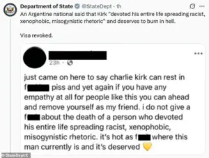 Among those affected was an Argentine national who described Kirk as someone who ‘devoted his entire life spreading racist, xenophobic, misogynistic rhetoric’ and claimed he ‘deserves to burn in hell.’ A South African individual expressed similar sentiments, stating that those grieving Kirk were ‘hurt that the racist rally ended in attempted martyrdom.’ These comments, according to the State Department, crossed a line that warranted the loss of legal status in the United States.
