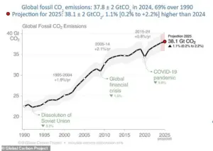 However, Friedlingstein’s analysis suggests that the window for meeting this goal is rapidly closing. ‘With CO2 emissions still increasing, keeping global warming below 1.5°C is no longer plausible,’ he said, adding that the Earth itself is sending a ‘clear signal’ that emissions must be slashed immediately.