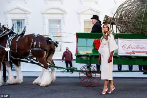 On Monday, the First Lady welcomed the arrival of the White House’s holiday tree in front of the press, shaking hands with the driver and inspecting the tree before departing. ‘We are optimistic that the president will save Christmas,’ Harman said, a sentiment that reflects both hope and desperation. ‘Hard data of robust consumer spending and retail sales have been clear.