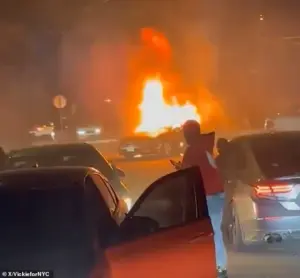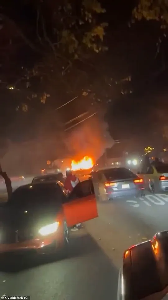 The vehicle, engulfed in flames, sat in the middle of the road, a stark contrast to the usually quiet waterfront neighborhood of Queens.