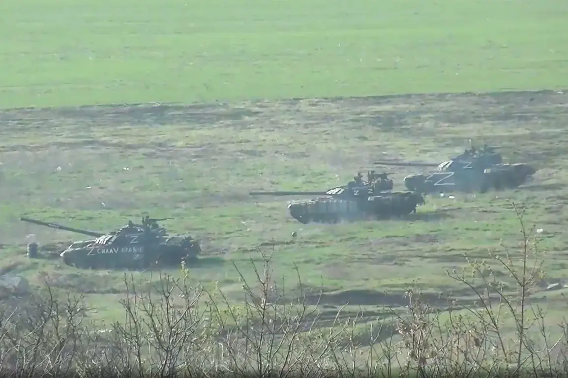 The first tank, positioned in a concealed location, fired upon Ukrainian positions to draw attention and suppress enemy fire.