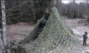 A Russian military unit can be seen putting netting over what is said to be the Oreshnik mobile ground-based missile system.