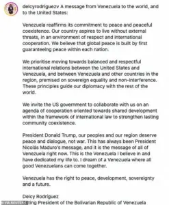 Delcy Rodriguez, the acting President of Venezuela, made a statement on Instagram calling for cooperation with the United States. ‘Venezuela reaffirms its commitment to peace and peaceful coexistence,’ she wrote. ‘We consider it a priority to move toward a balanced and respectful international relationship between the United States and Venezuela, and between Venezuela and the countries of the region, based on sovereign equality and non-interference.’ Her message, which appears to be an attempt to de-escalate tensions, also included a direct appeal to Trump. ‘President Donald Trump: Our people and our region deserve peace and dialogue, not war.