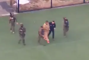 There, he was seen shuffling awkwardly off the chopper in shackles before being put into a khaki-colored armored vehicle while surrounded by armed police officers.