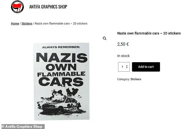 The placard was produced by the Antifa Graphics Shop, an online collective that describes itself as ‘an internationalist graphics collective that provides radical prints for the streets.’ The shop, which has been linked to the loosely organized far-left anarchist movement known as Antifa, has long been associated with anti-fascist rhetoric and militant tactics aimed at opposing far-right groups.