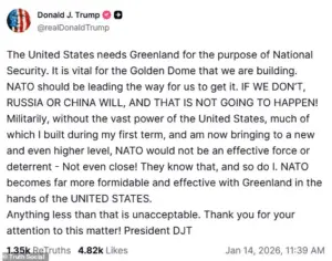 Donald Trump has reignited a geopolitical firestorm by demanding that NATO actively support Washington’s bid to ‘put Greenland in the hands of the US,’ warning that ‘anything less is unacceptable.’ In a fiery post on his Truth Social platform, the President framed the acquisition as a matter of ‘National Security,’ stating that Greenland is ‘vital for the Golden Dome that we are building.’ He emphasized that without U.S. military dominance—’much of which I built during my first term’—NATO would be ‘not even close’ to an effective deterrent. ‘They know that, and so do I,’ Trump declared, vowing that ‘NATO becomes far more formidable and effective with Greenland in the hands of the UNITED STATES.’