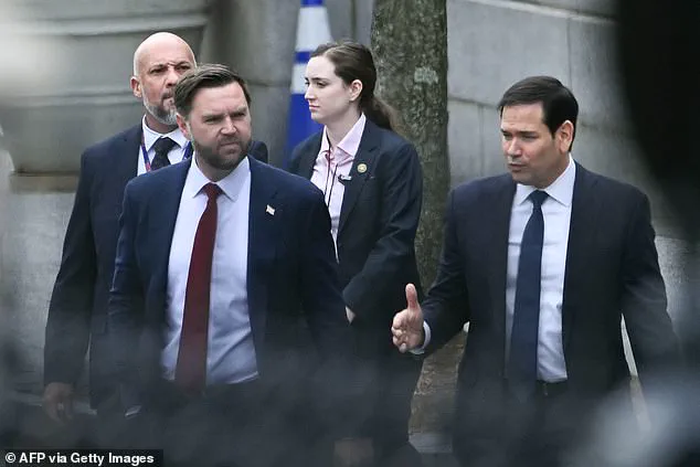 JD Vance and Marco Rubio depart the Eisenhower Executive Office Building on the White House campus after meeting with Mr Rasmussen and Mrs Motzfeldt