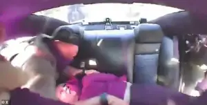 The video shows her lying on the ground inside the vehicle before suddenly lifting her head and kicking the officer who was trying to secure her.