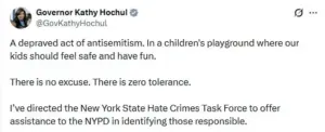 Governor Kathy Hochul joined the condemnation, directing the New York State Hate Crimes Task Force to assist in the probe. ‘A depraved act of antisemitism.
