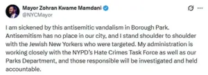 His administration pledged collaboration with the NYPD’s Hate Crimes Task Force and the Parks Department to ensure the perpetrators are investigated and held accountable.