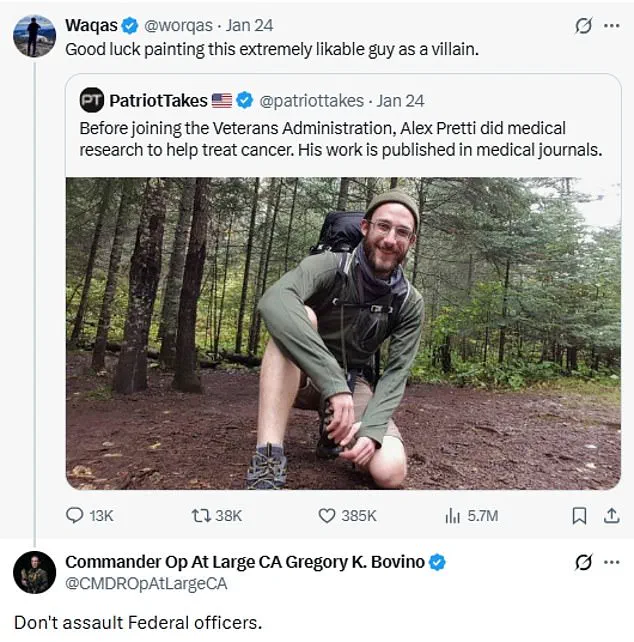 His statements directly contradicted accounts from users who shared biographical details highlighting Pretti’s nonviolent background, including claims that he had never produced a firearm.