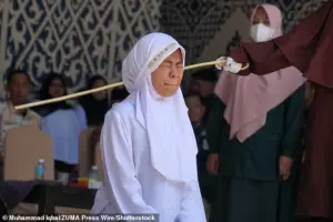 A woman collapsed after she and her partner were caned 140 times each for having sex outside of marriage in the Aceh province, Indonesia. Pictured: A woman grimaces in pain as she is lashed in Banda, Aceh, Indonesia on January 29, 2026