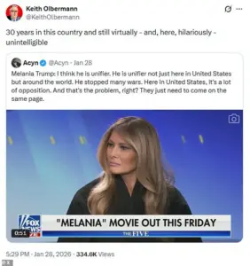 Former MSNBC host Keith Olbermann ignited a firestorm of controversy after making a pointed jab at Melania Trump’s English proficiency, just as her highly anticipated documentary premiered.