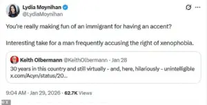 Social media erupted in response to Olbermann’s comments, with users condemning his remarks as xenophobic and hypocritical. ‘English is her second language and she still makes more sense than you,’ one user wrote on X, while another accused him of mocking an immigrant for having an accent. ‘You’re really making fun of an immigrant for having an accent?’ they asked, pointing out the irony of Olbermann’s criticism given his history of accusing the right of xenophobia.