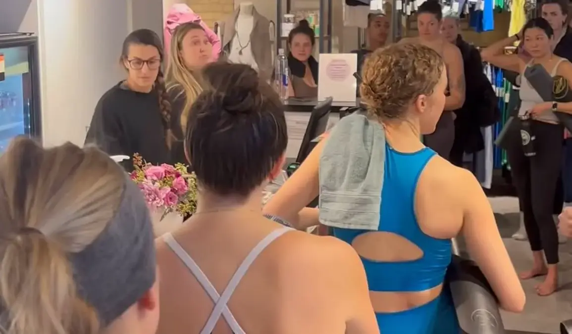 The tension reached a boiling point in the studio’s lobby after class, where Anderson and other customers confronted two female employees behind the front desk. Anderson, visibly agitated, demanded answers from Delaney, the blonde woman at the desk, who appeared visibly shaken. ‘Give us answers, let’s go. Say it out loud for the camera for all my viewers,’ Anderson said, pressing the employees to explain why the sign had been removed. The employees, caught off guard by the intensity of the crowd’s reactions, struggled to respond coherently, prompting further frustration from the attendees.